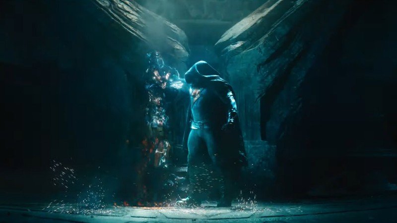 Johnson reveals Black Adam has entered the post-production process, gearing up for its release in theaters on July 29, 2022. In the video above, you can catch a glimpse of some concept art and a short scene from the film. The new footage shows a woman reading an ancient text carved on the stone floor after discovering a levitating crown. Upon reading the word “Shazam” aloud, the scripts glow and a bolt of lightning shatters the darkness in the ruins. A hooded Black Adam rises from where the bolt struck. He grabs a soldier electrocutes him, frying the man down to the bone. Adam then floats into the air as a volley of futile bullets bounces harmlessly off of his pitch-black suit.