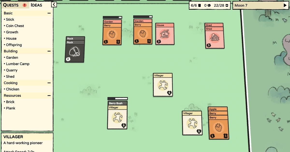 The challenge ramps up, but it never feels like a steep learning curve. The first big hurdle is keeping villagers fed. This is how I initially spiraled out of control on my first run: Berry bushes have limited uses before disappearing, so I had to craft something renewable. My villagers starved before I could figure it out. On my second run, I stockpiled food before realizing there was a maximum card limit. The game also throws in silly curveballs. Random chaotic cards show up in card packs, like a “chicken” that produced “egg” — great for crafting “omelet” — but the damn chicken also rambled about the play space, causing chaos. My neat piles of cards became a disorganized splay.