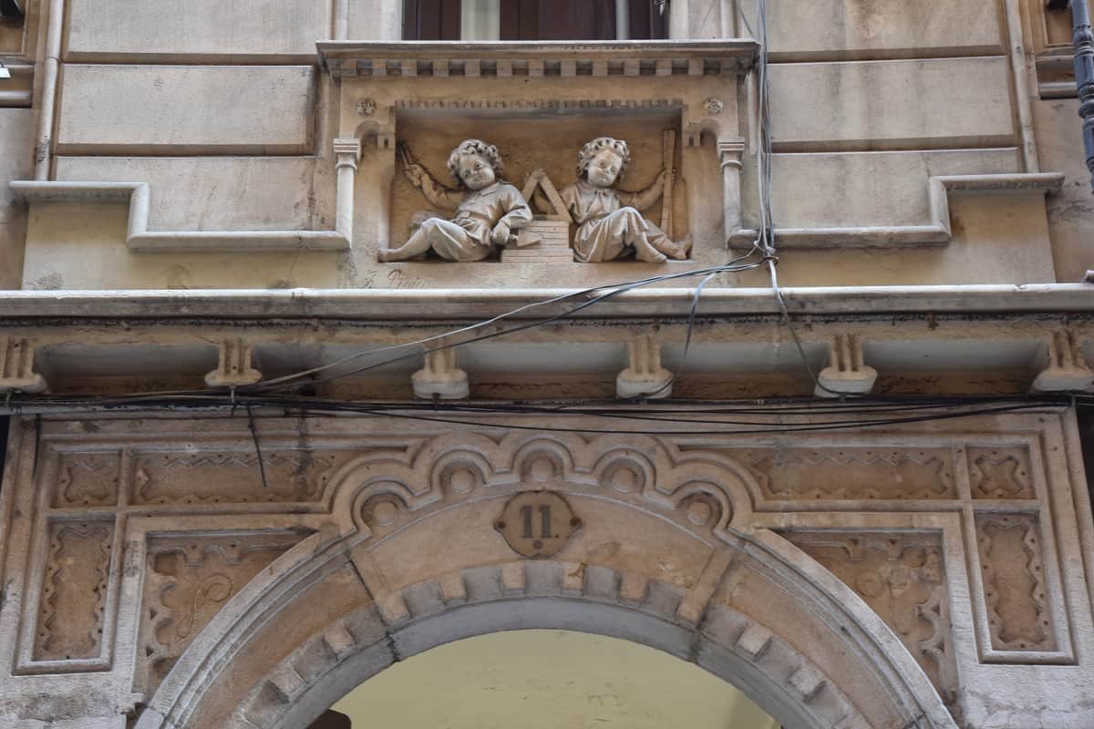 Above the entrance of Carrer de la Portaferrissa, 11 in the Gothic Quarter is a small scultpure of two children holding the tools of medieval masons.